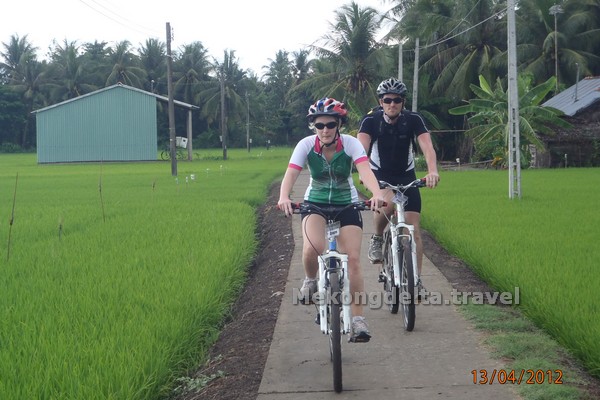 The cycling Mekong delta day tour starts in Cai Be town, where you will cycle 25 km on small single track trails or countryside roads through fruit orchards in the rural areas of Cay Lay and Cai Be.